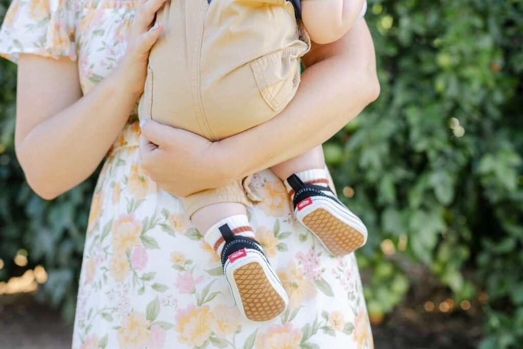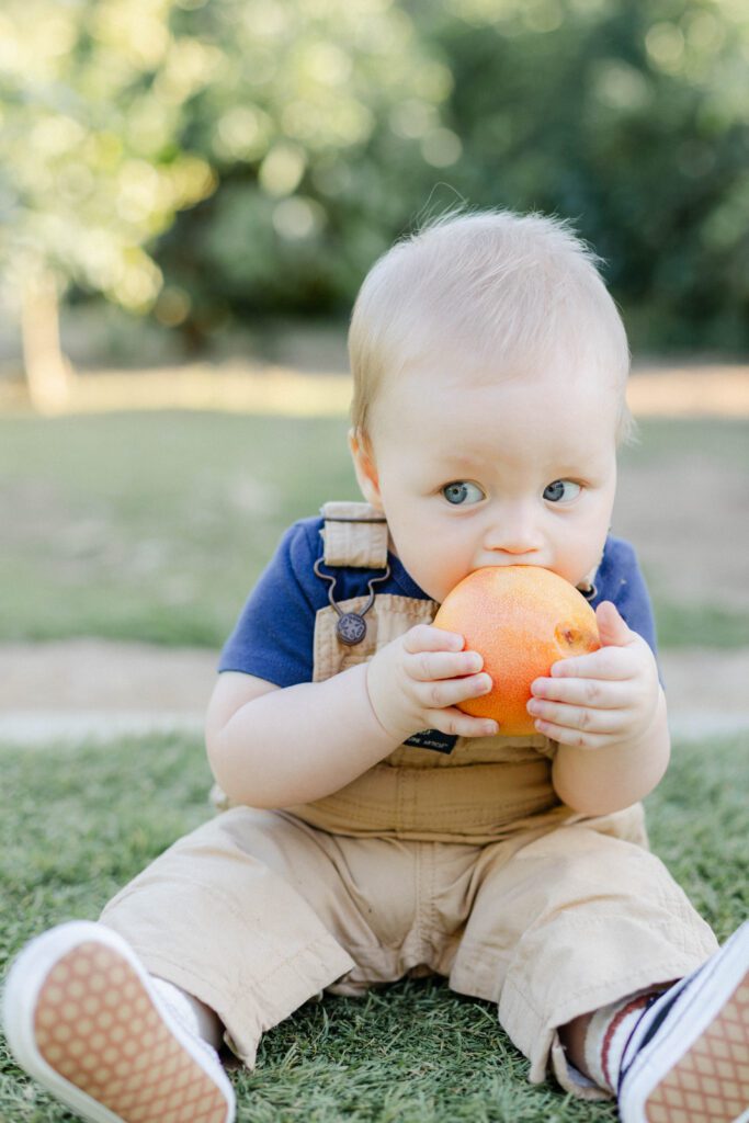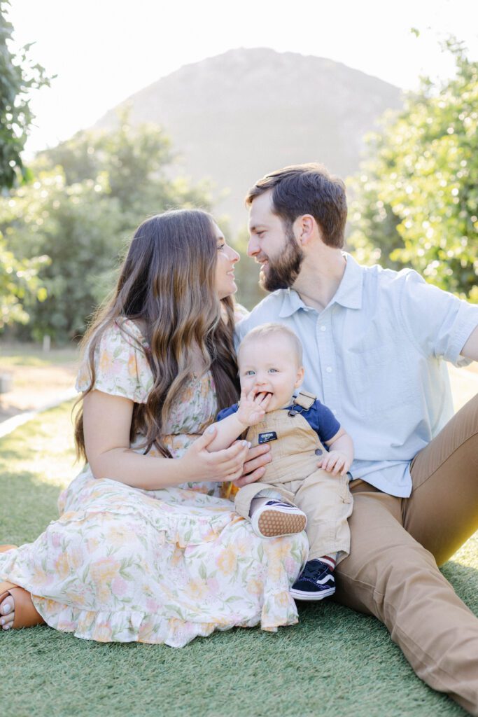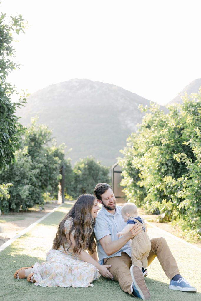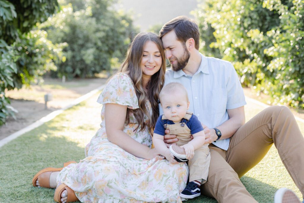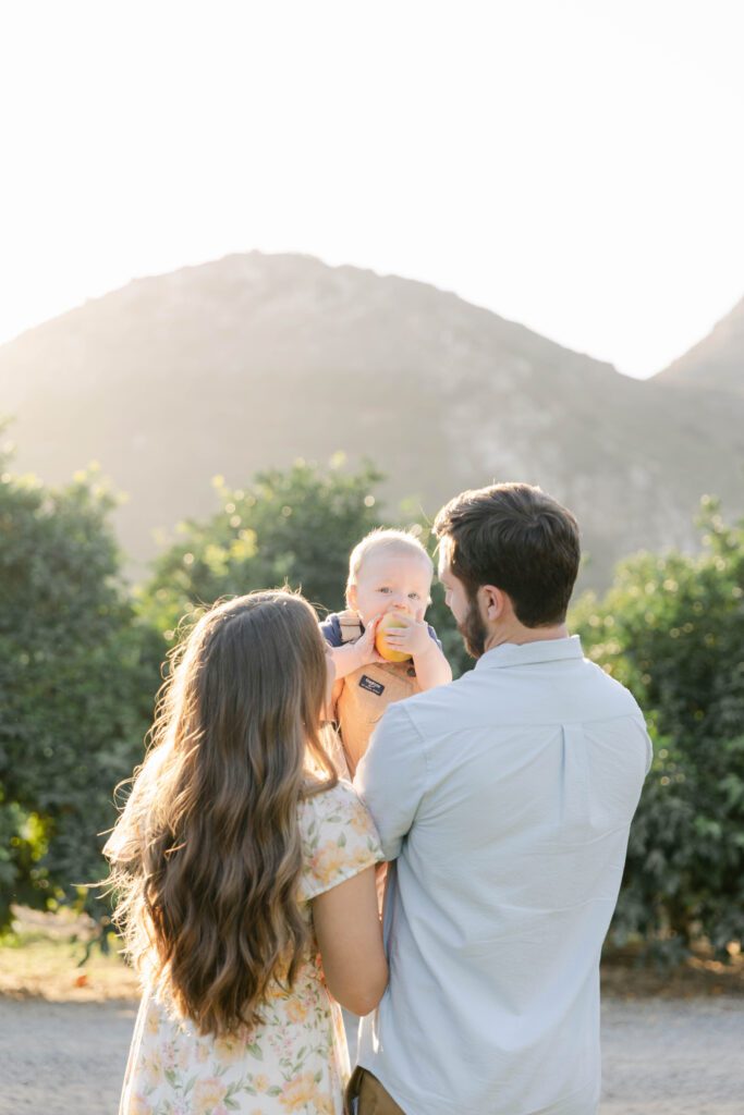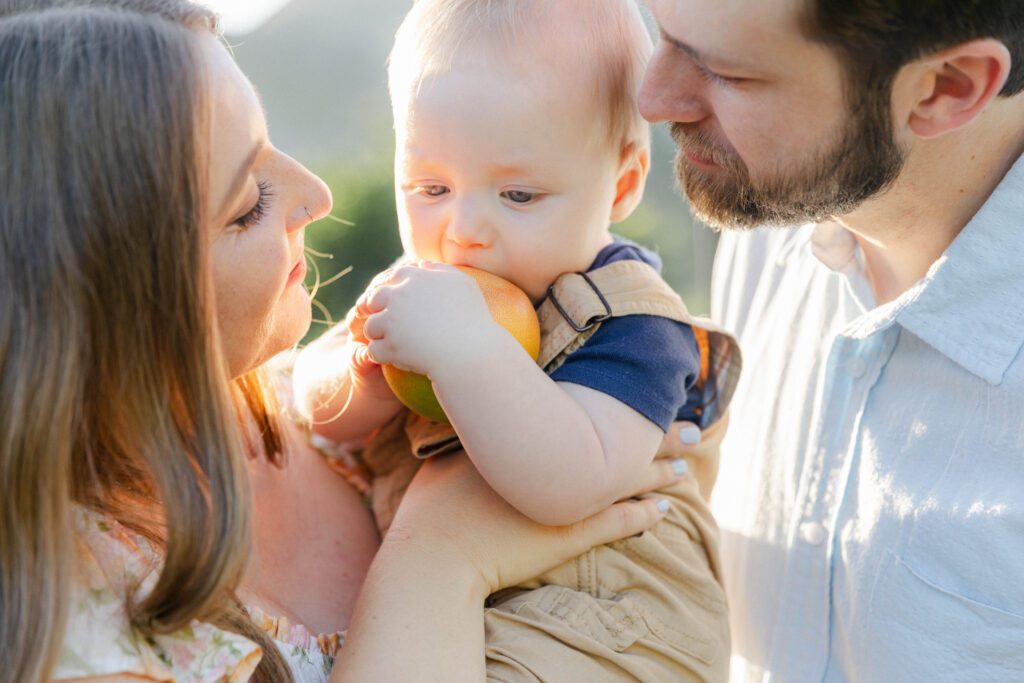 The images from this session feel timeless. There are classic portraits, yes, but also storytelling images that pull you right into the moment: the three of them walking near the same grove they once stood beside as newlyweds, N chomping on a grapefruit that fell in the orchard, mom and dad pressing a soft kiss on their son’s head while N’s favorite song played in the background.